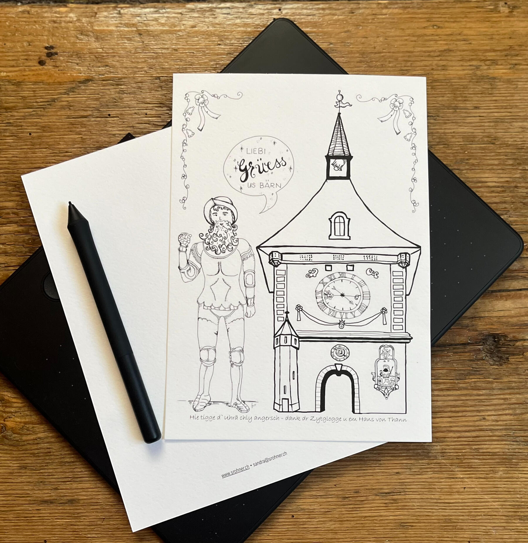 Ausmal-Postkarte A5, Zytglogge und Hans von Thann